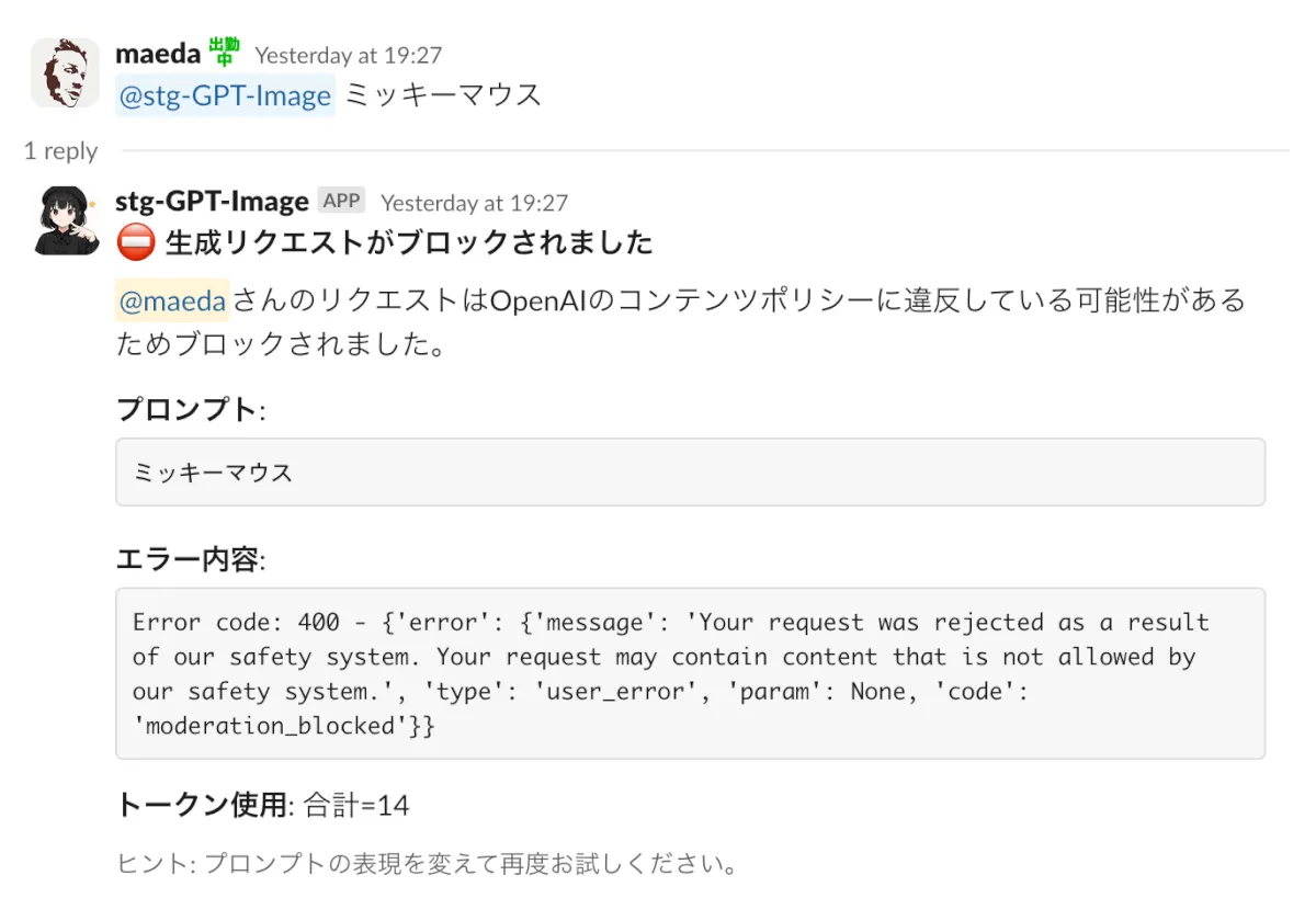 OpenAI側でポリシー違反でブロックされるケースとされないケースがある。