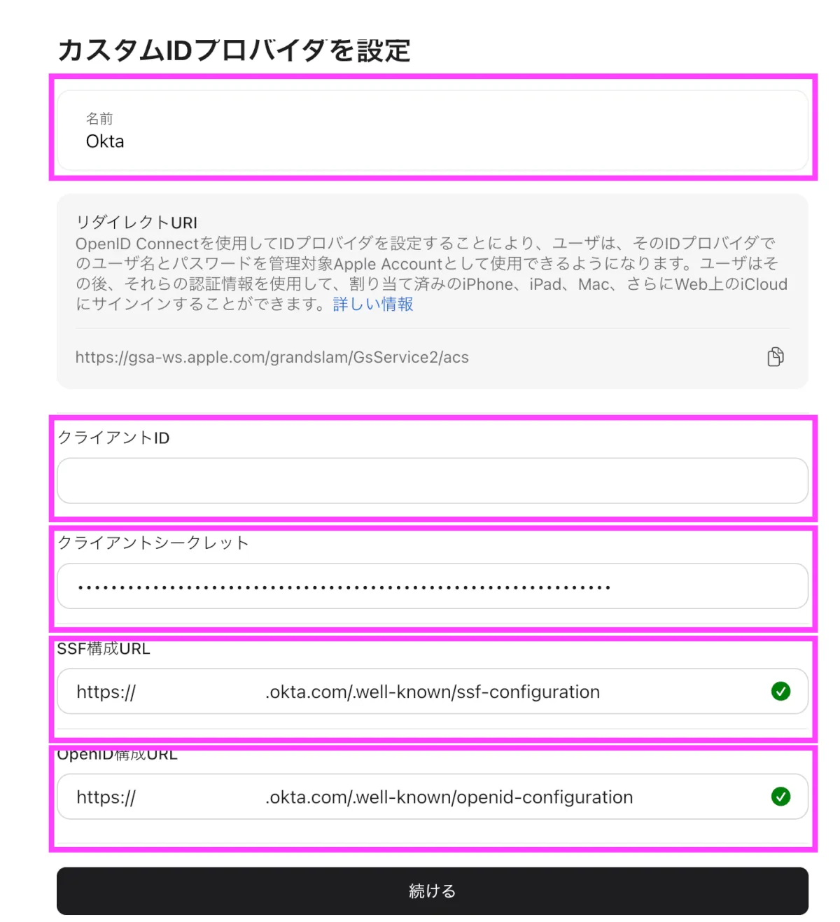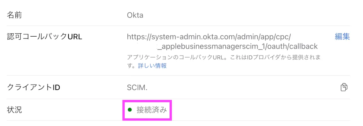 - クライアントシークレット:Okta「Apple Business Manager OIDC」アプリケーションのクライアントシークレット