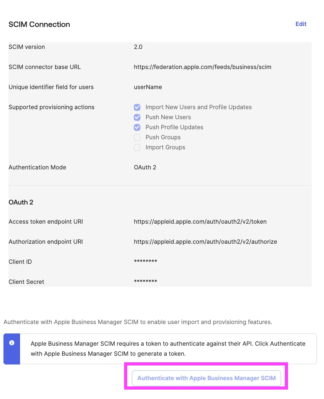 3. 「Save(保存)」後、「Authenticate with Apple Business Manager SCIM」より接続をします。