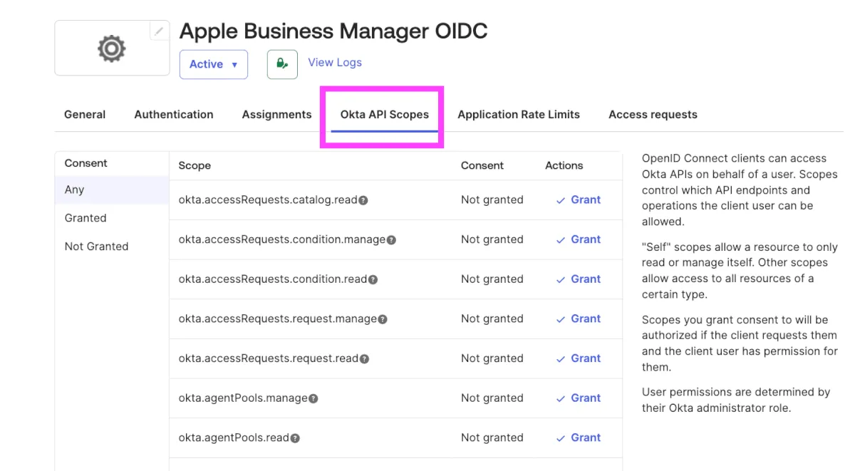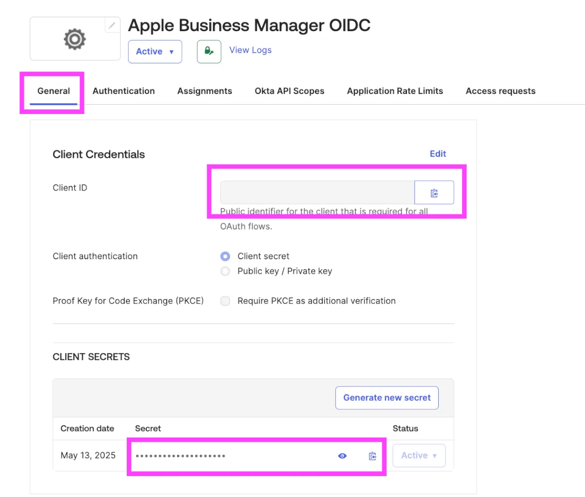 Okta - クライアントID:Okta「Apple Business Manager OIDC」アプリケーションのクライアントID
