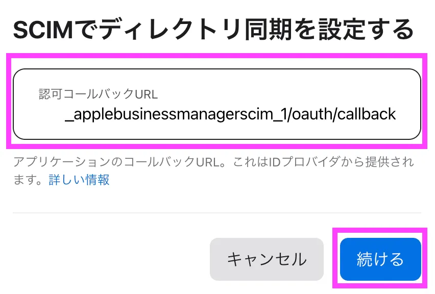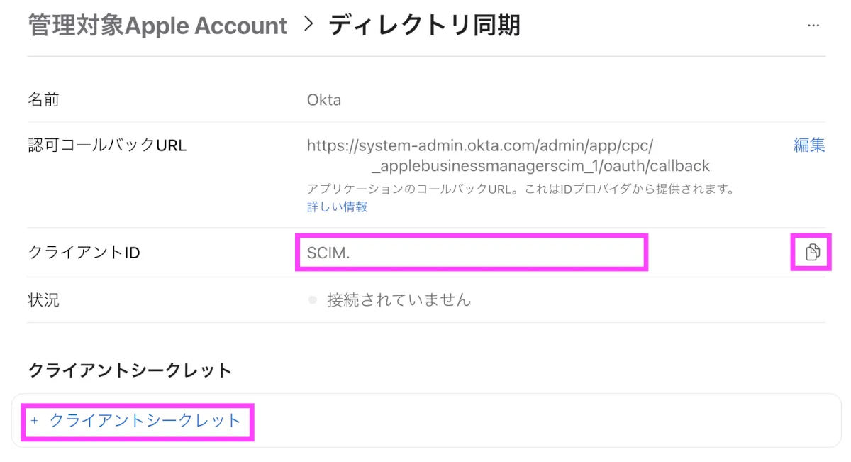 - Client Secret(クライアントシークレット):ABM「ディレクトリ同期」のクライアントシークレット