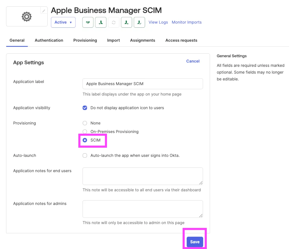 - 「Apple Business Manager SCIM」アプリケーションのGeneral(一般)タブから、ProvisioningをSCIMに変更します。