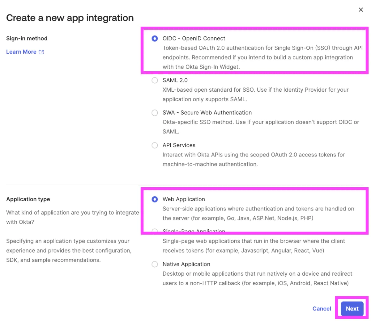 - サインイン方式として「OIDC – OpenID Connect」、アプリケーションタイプとして「Web Application(Webアプリケーション)」を選択し、「Next(次へ)」をクリックします。