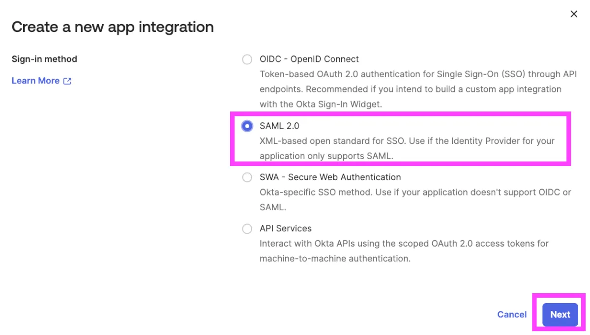 - サインイン方式として「SAML 2.0」を選択し、「Next(次へ)」をクリックします。