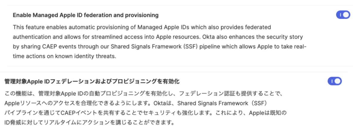 Okta管理コンソールから、Settings(設定) > Features(機能)にアクセスし、「Managed Apple ID Federation and Provisioning(マネージドApple IDの連携認証とプロビジョニング)」機能を探して有効化します。