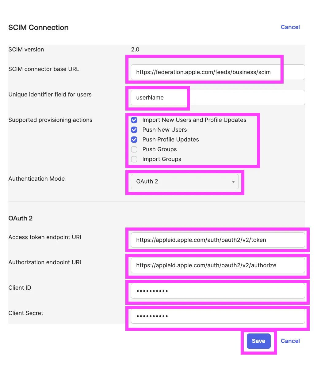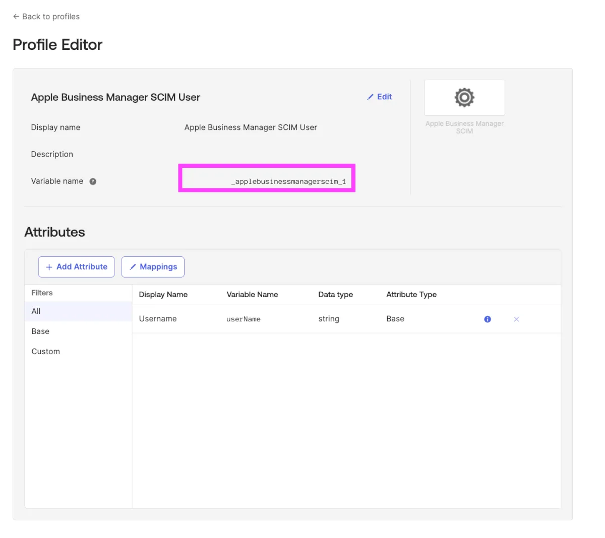 https://federation.apple.com/feeds/business/scim - Unique identifier field for users(ユーザーの一意識別子フィールド):