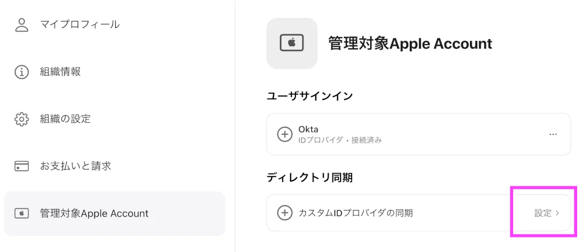 - 環境設定 > 管理対象Apple Account > ユーザーサインインとディレクトリ同期より、「今すぐ始める」「カスタムIDプロパイダ」をクリックします。