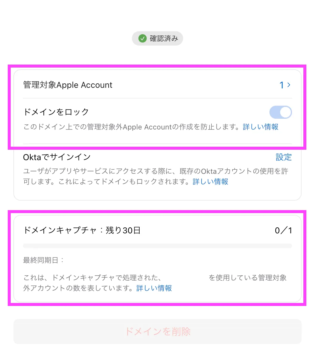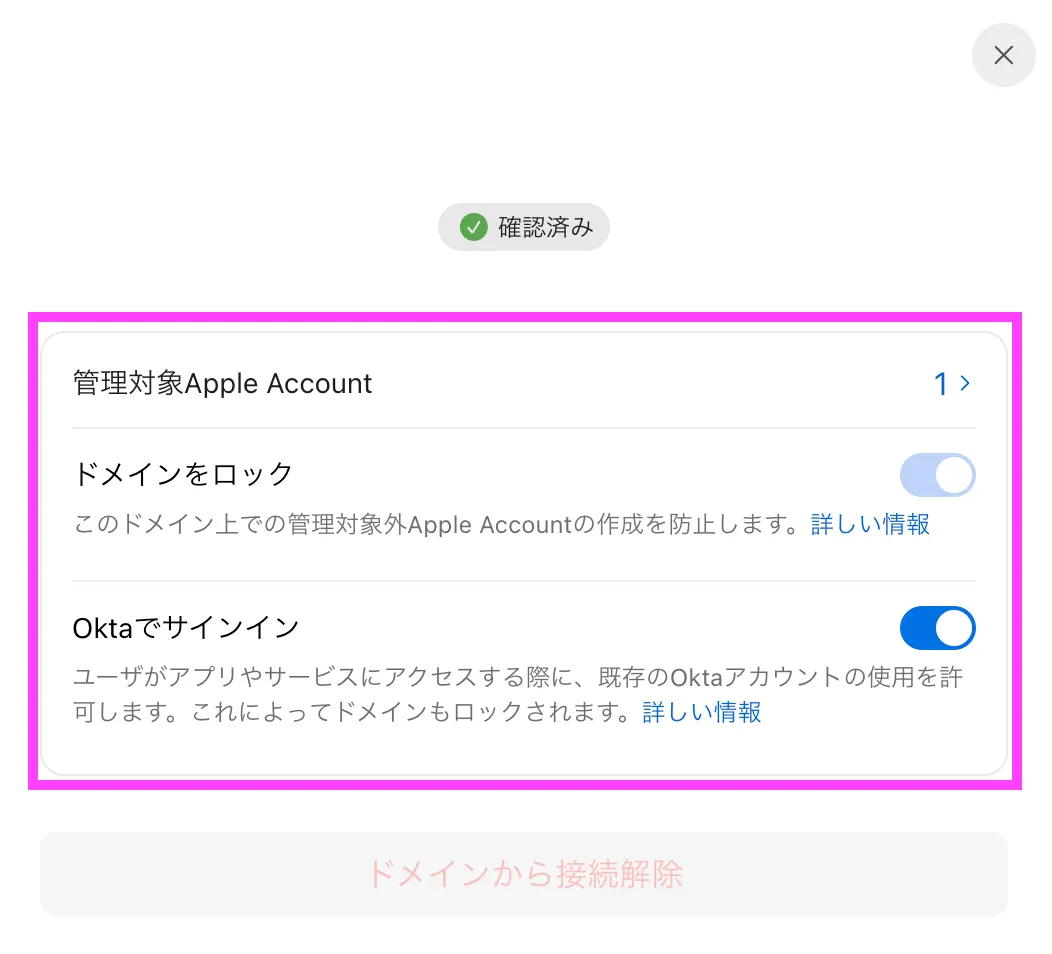 5. ABMの「管理対象Apple Account」の「ドメイン」管理より「Oktaでサインイン」を有効にします。