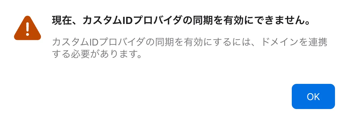 現在、カスタムIDプロパイダの同期を有効にできません。というエラーが表示されます。