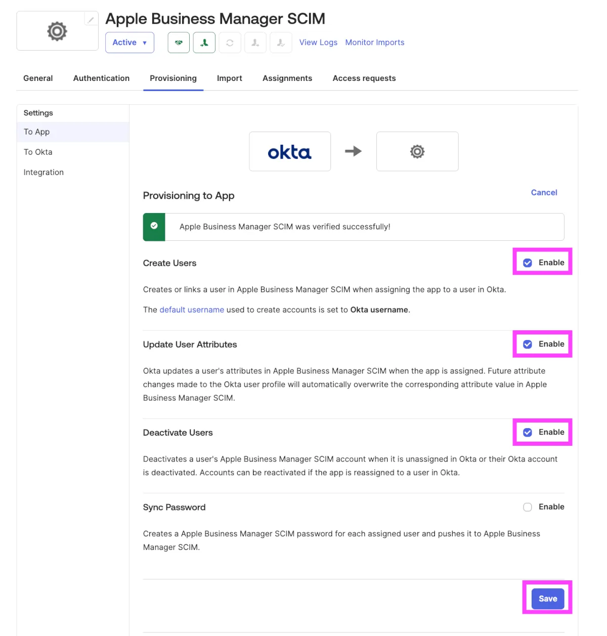 4. Provisioningの「To App」画面にて以下を有効化し「Save(保存)」します。これで設定は完了です。