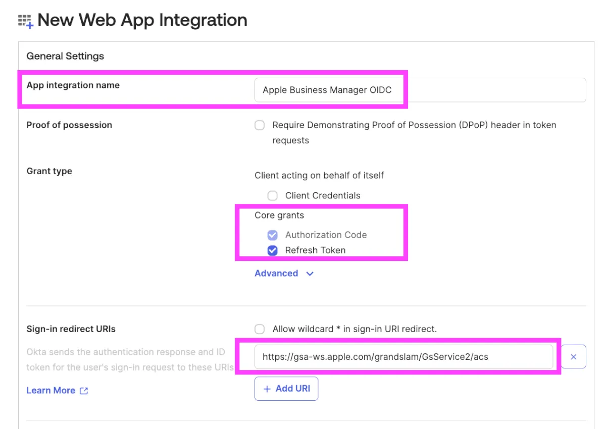 Apple Business Manager OIDC - Grant type(付与タイプ):以下をチェック