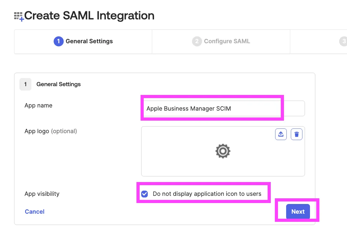 Apple Business Manager SCIM - 「Do not display application icon to users」選択し、「Next(次へ)」をクリックします。