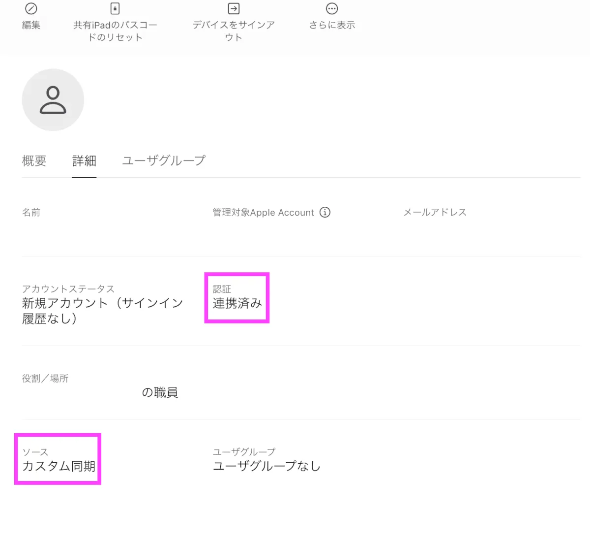 4. ABMのユーザー画面で認証「連携済み」、ソース「カスタム同期」となっていることを確認します。