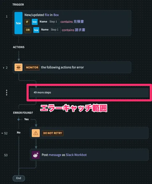 Workatoの場合、以下のような形で一定の範囲内でエラーが発生した場合、エラーをキャッチしたときの処理を一括で実装することができます。