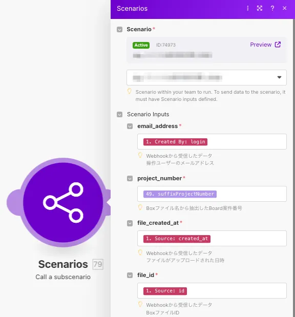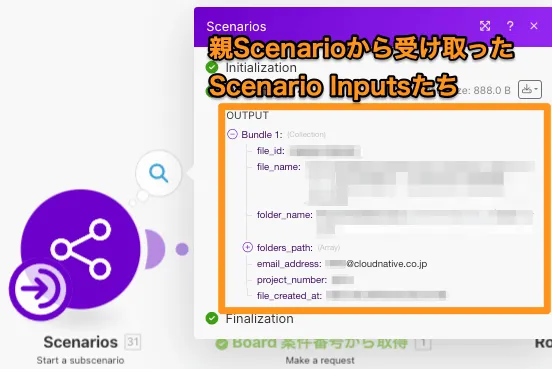 Call a subscenarioで渡した値を見る。つまり、親Scenarioの実行履歴を確認する。 - 子Scenario内のModuleで