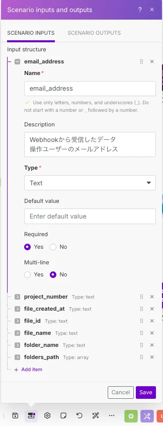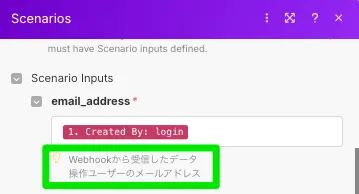 ちなみに、説明欄(Description)は、親Scenarioから渡す値を指定する際に表示されます。Scenario Inputsを設定するときの必須項目ではありませんが、記載することをオススメします。
