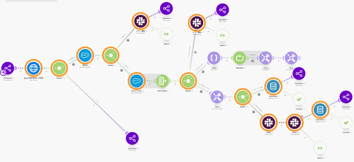 - Scenario:どのような処理を自動化するか定義されたものです。ZapierのZaps、Power Automateのフロー、WorkatoのRecipeに相当します。