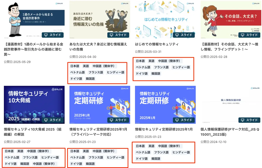 - 多言語対応している教材をセキュリオのeラーニング機能で従業員に配信します