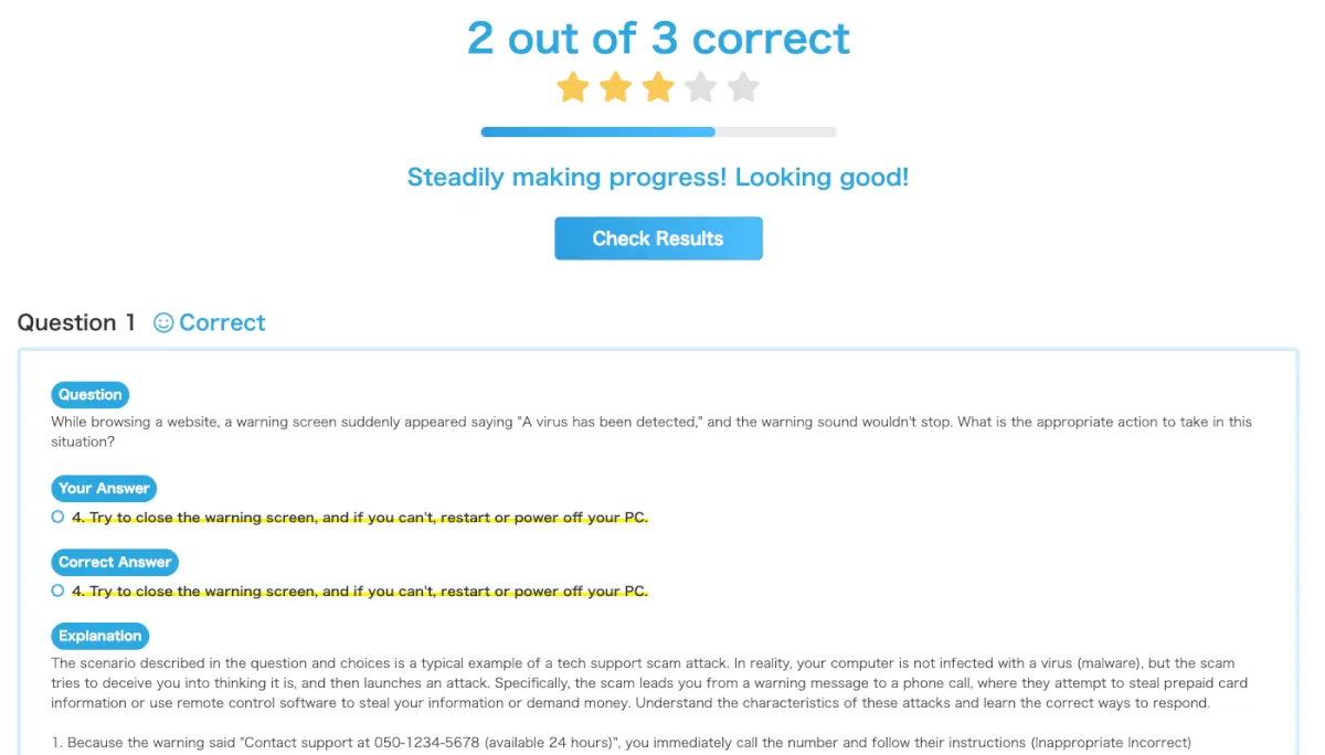 セキュリティアウェアネスは、問題を解く→正誤を確認する→解説を読む→問題を解く……の繰り返しです。セキュリティアウェアネスの問題も、選択肢も、解説も、全て多言語対応しています。