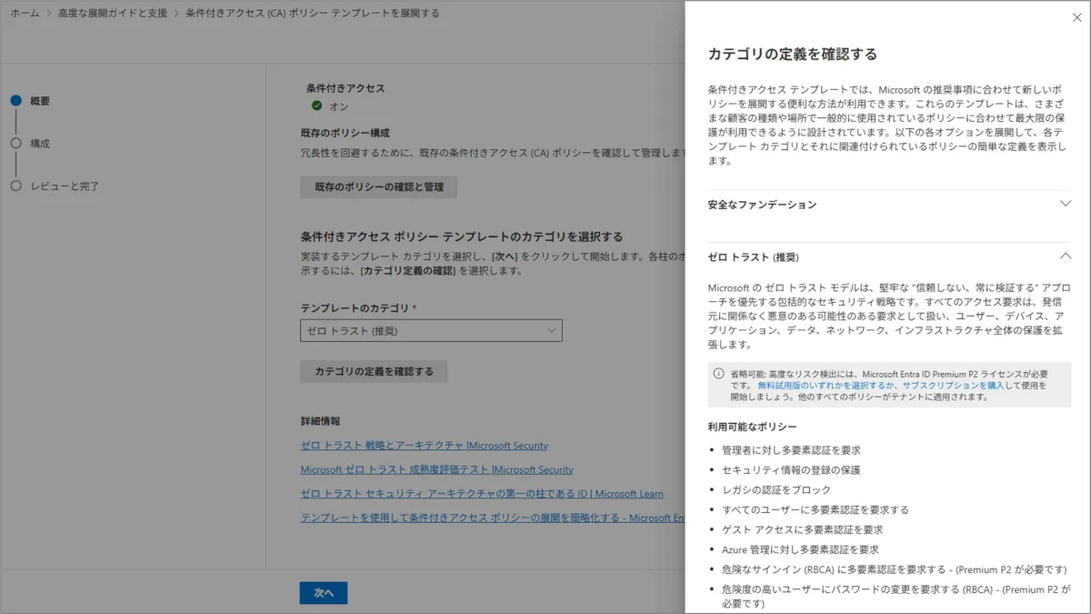 - [カテゴリの定義を確認する] から、各テンプレートで展開されるポリシーの概要を確認することができます