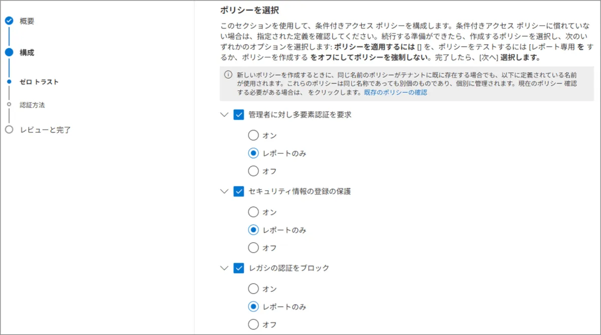 - 今回は全ポリシーを作成し、[レポートのみ] として展開するよう設定します