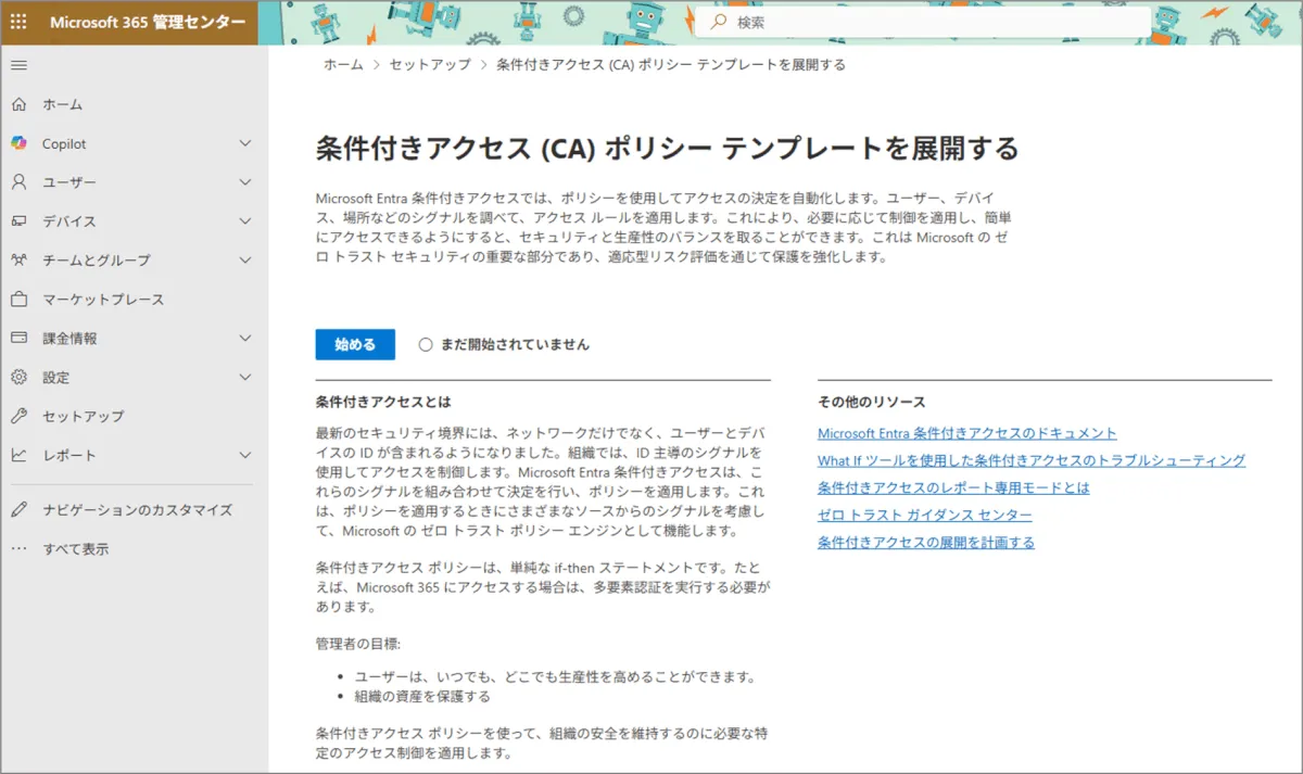② [セットアップ] – [サインインとセキュリティ] – [条件付きアクセス (CA) ポリシー テンプレートを展開する] を開き、[始める] をクリックします