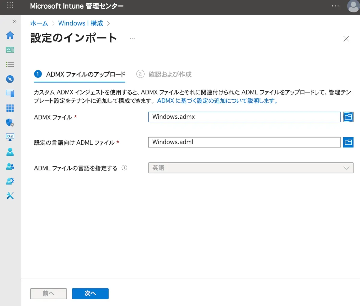 - Intune管理センター > [デバイス] > [Windows] > [構成] > [ADMXのインポート] タブに移動し、[+ インポート] をクリックします。