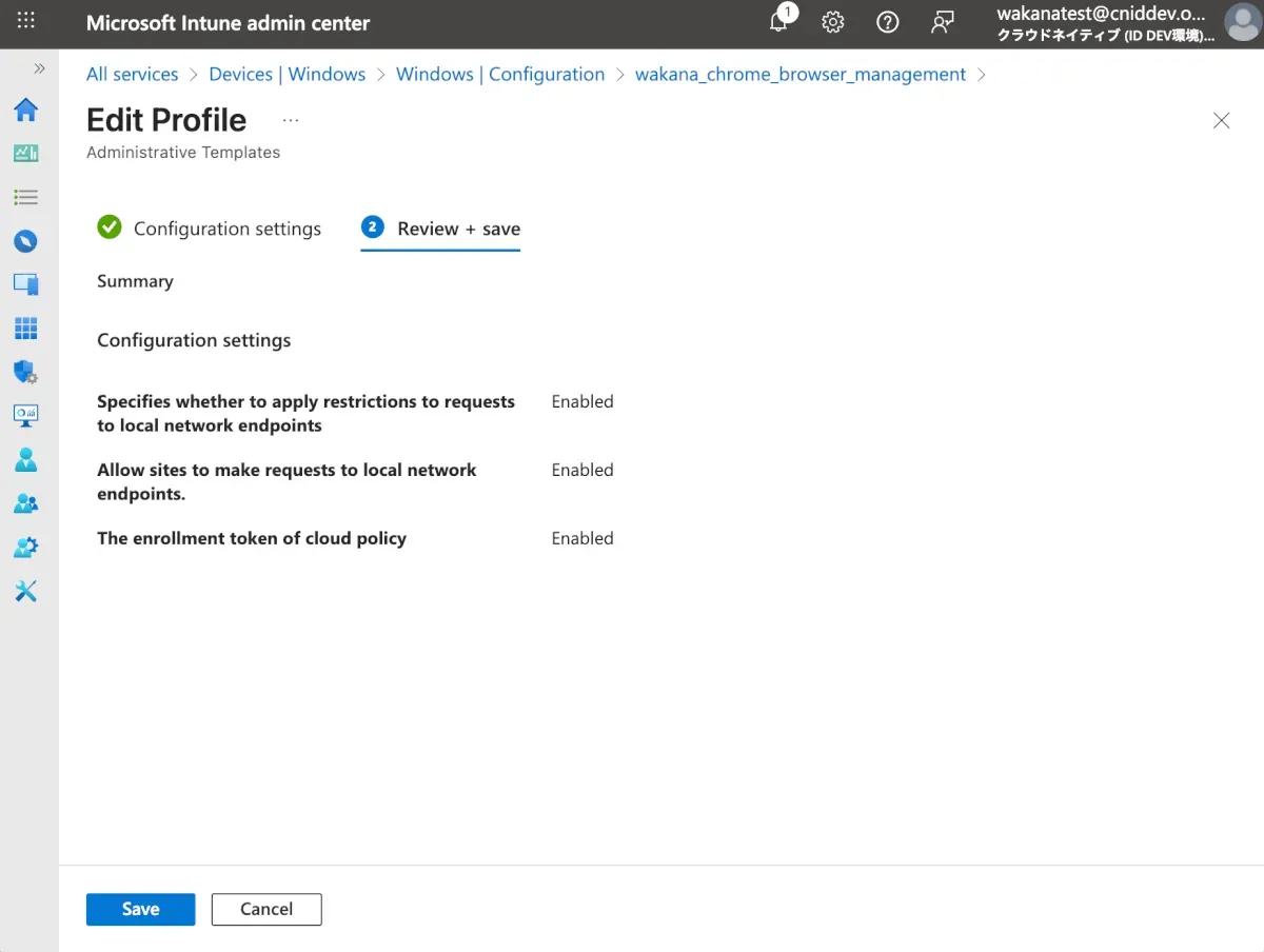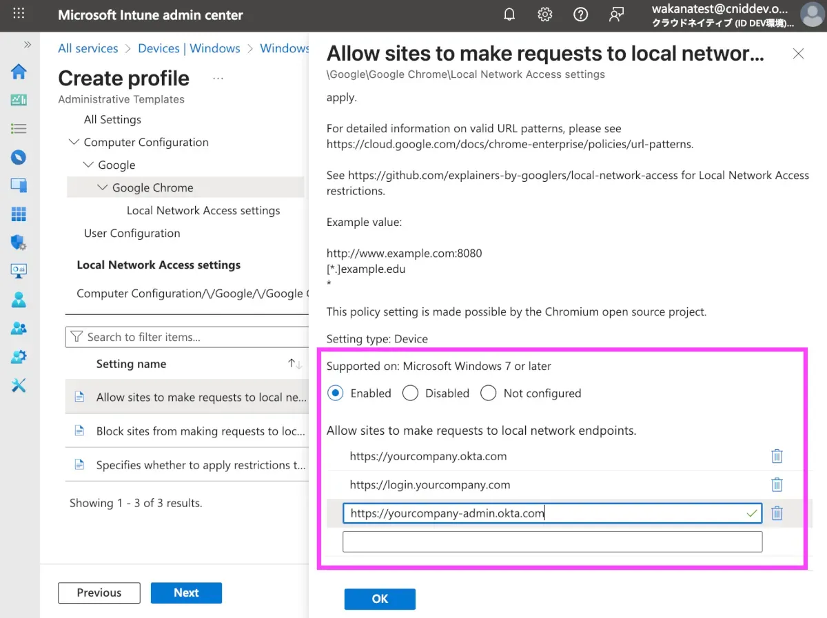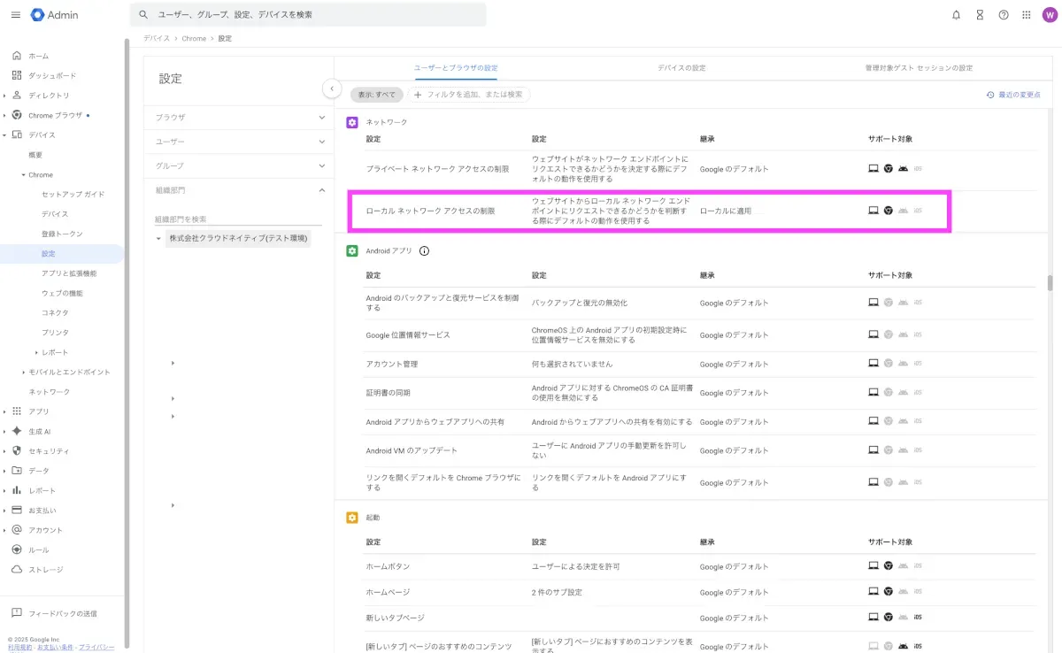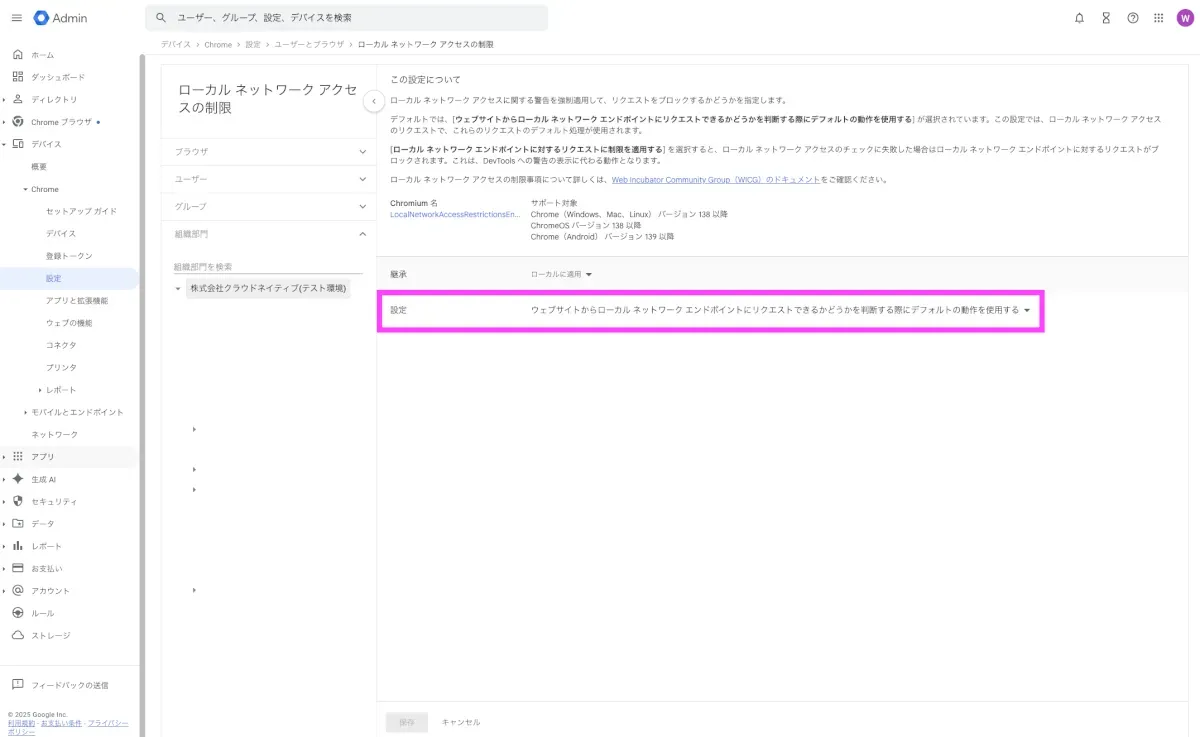 - [構成設定] タブで、[コンピューターの構成] > [Google] > [Google Chrome] > [Local Network Access settings] を選択し、以下の項目を設定します。