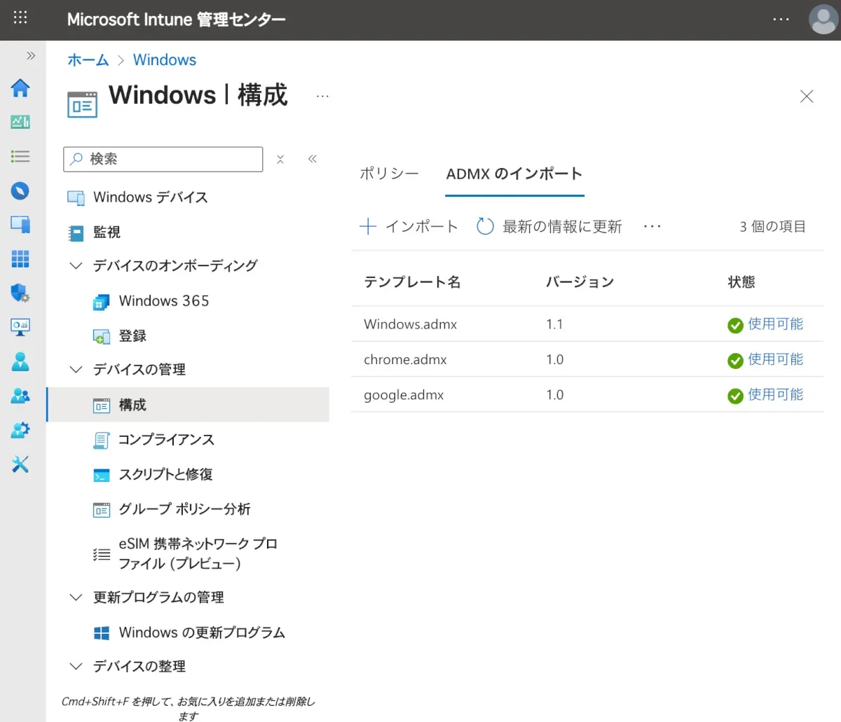 IntuneでWindowsデバイス上のChromeブラウザを管理するには、まずChromeの「管理用テンプレート(ADMX)」をIntuneにインポートする必要があります。これにより、IntuneからChromeの様々な設定を制御できるようになります。
