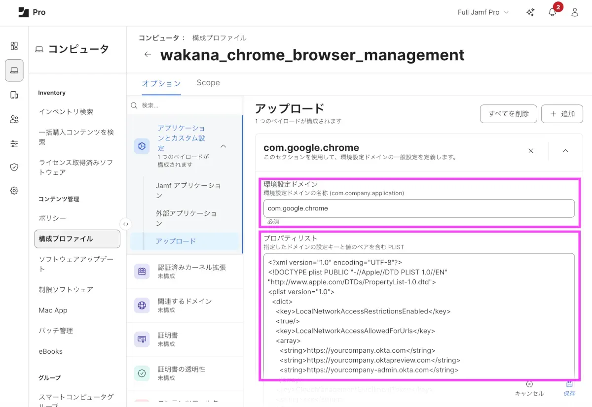 Jamf ProでmacOSデバイス上のChromeブラウザを管理するには、「構成プロファイル」に特定のキーと値(Payload)を記述して配布します。
