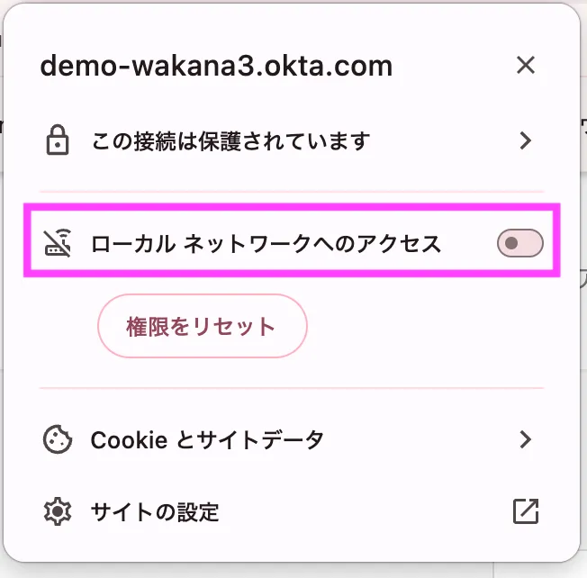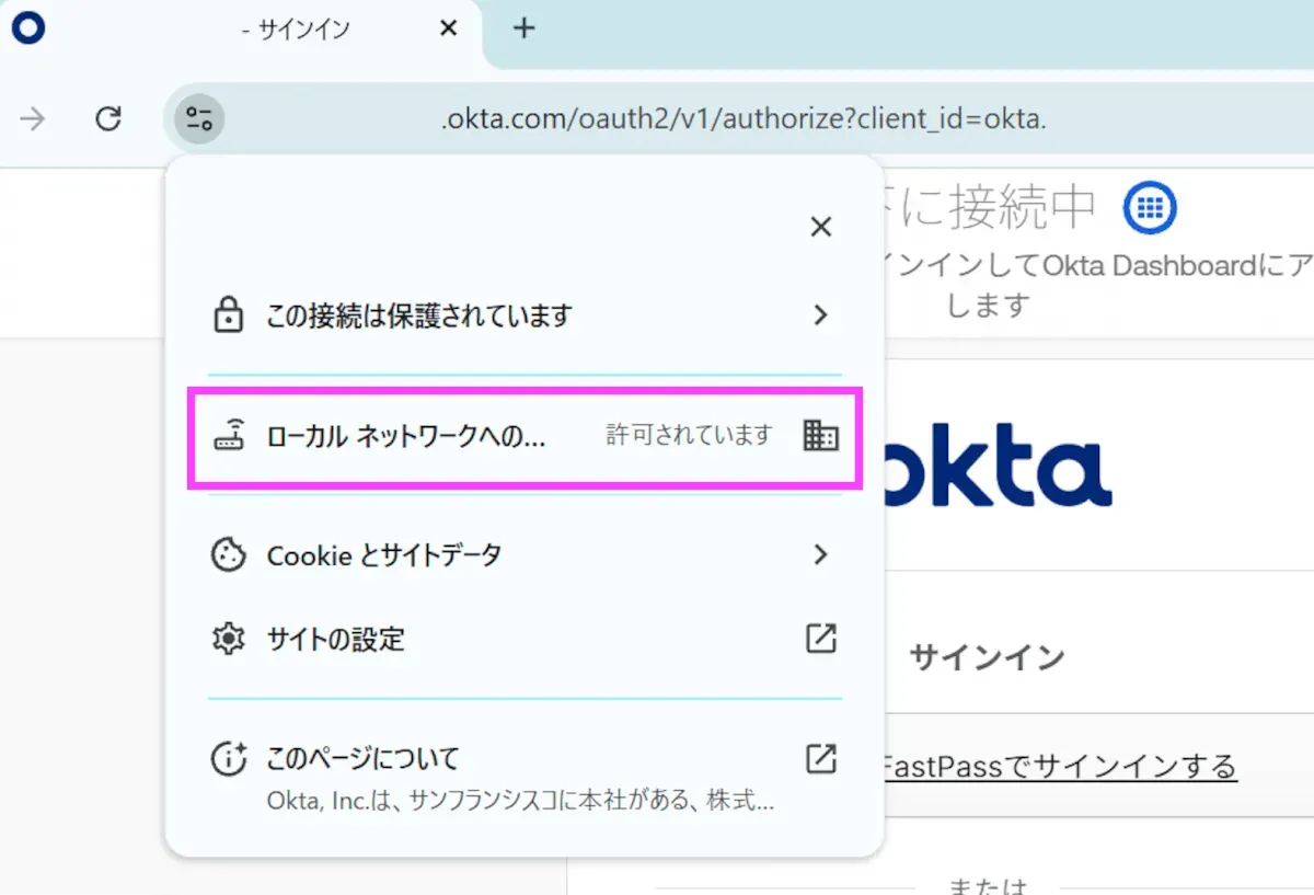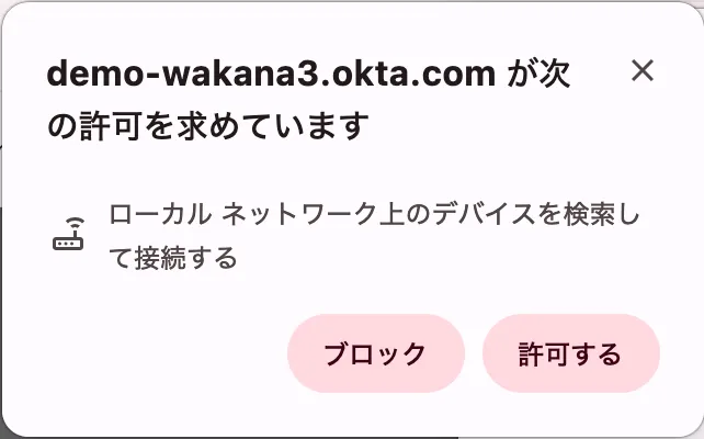 - Okta FastPassによるサインイン時、Chromeが「ローカルネットワークへのアクセス許可(Local Network Access)」を求めるプロンプトを表示するようになります。