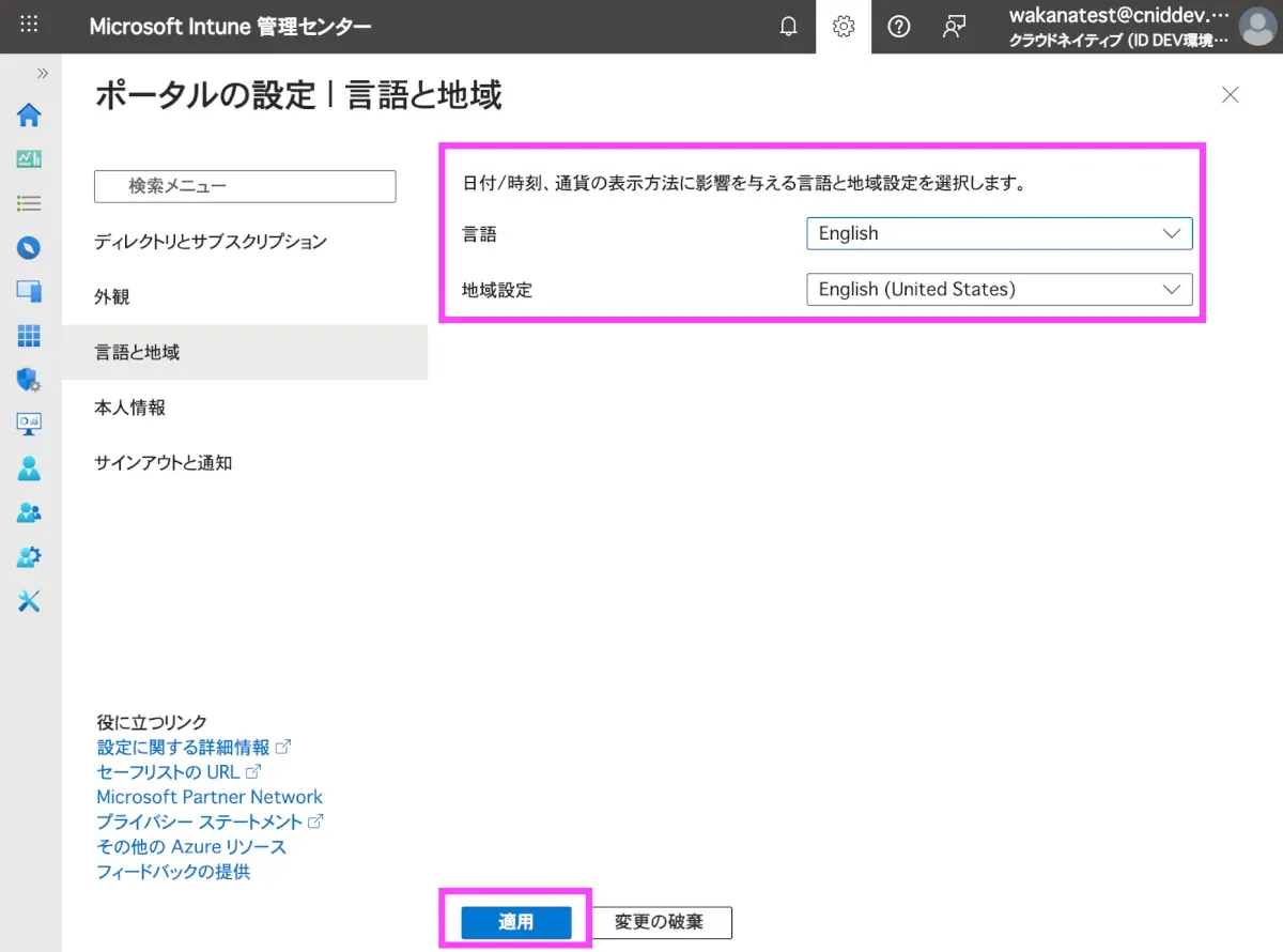 なお、構成プロファイル作成後はプロパティで設定が表示されない場合があり、設定を確認したい場合は Intune 管理センターの上部バーにある [歯車] アイコン > [言語と地域] よりEnglishに変更することで表示されます。