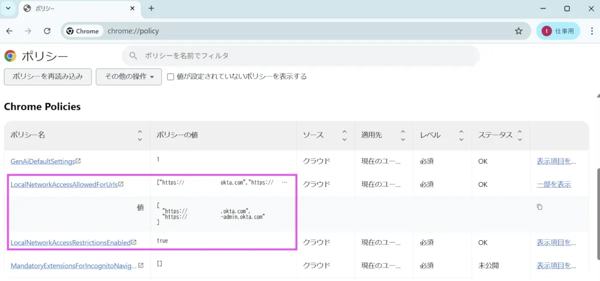 この設定は、Chrome や Edge がパブリックサイトからのローカルネットワークアクセスをどのように扱うかを制御するセキュリティポリシーです。Okta FastPassのプロンプト抑止には必須ではないため、本記事では補足として紹介します。