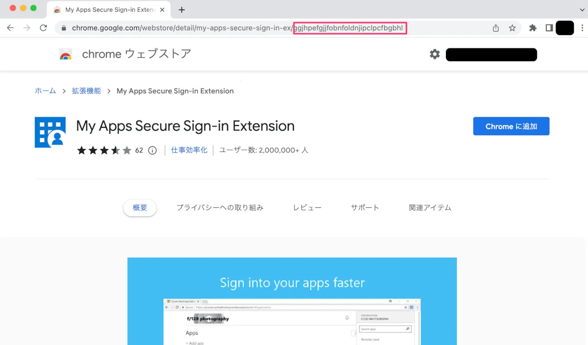 例:https://chrome.google.com/webstore/detail/my-apps-secure-sign-in-ex/ggjhpefgjjfobnfoldnjipclpcfbgbhl この場合の ID は ggjhpefgjjfobnfoldnjipclpcfbgbhl となります。