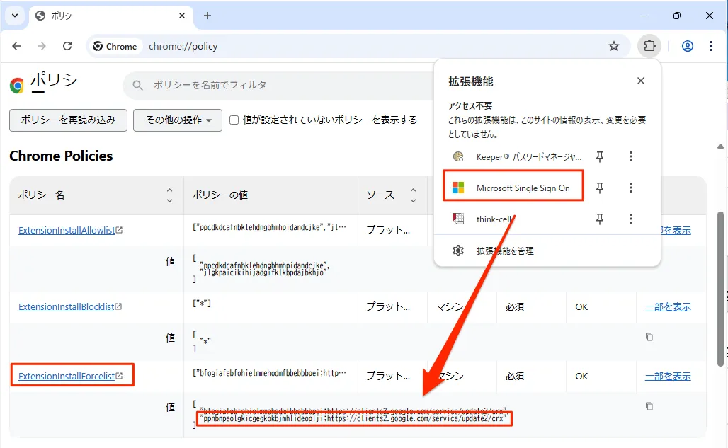 ExtensionInstallAllowlistやExtensionInstallForcelistなど、今回設定したポリシーが意図した値で適用されていることを確認します。