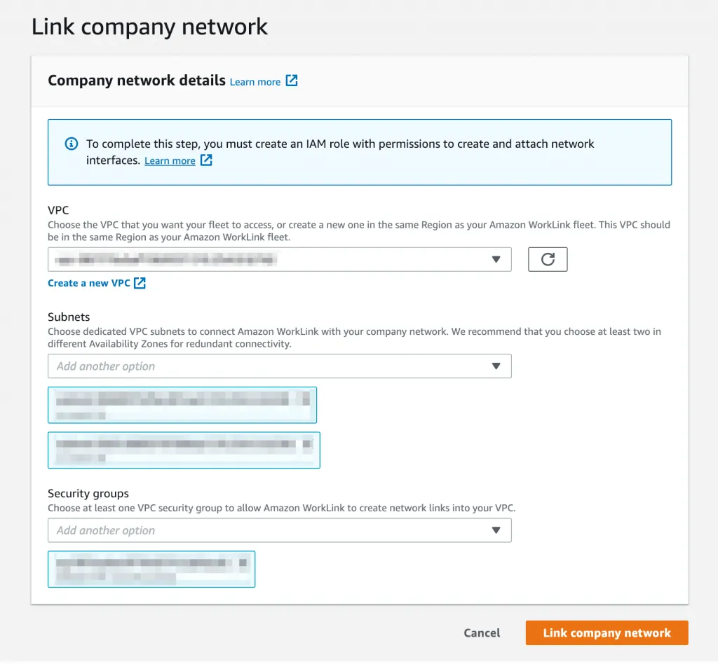 ネットワークの設定をします。VPN、サブネット、SGの設定を行います。 VPNは今回接続したいページのオリジンサーバーへのパスを持つか、または付与されている必要があります。 VPCピア接続や、AWS Direct Connect またはIPsec トンネルにも対応しています。 サブネットは2つ以上の設定が必要です。 SGは、WorkLinkのデフォルトのものを利用しました。