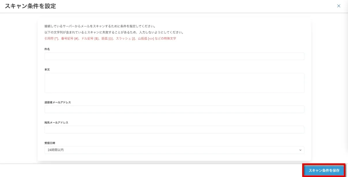 セキュリオにログインして[ホーム] > [フィッシング報告] > [スキャン(β)] > [スキャン条件を設定]で条件を入力し、[スキャン条件を保存]をクリックします。
