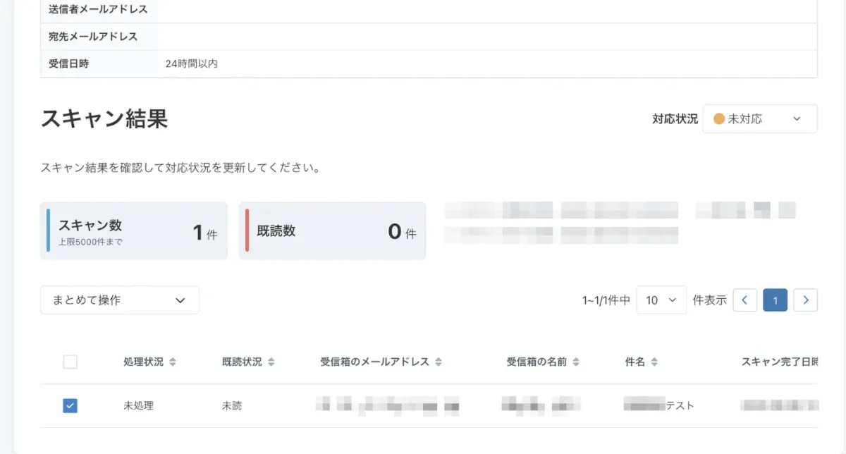 - スキャンされたメールにチェックを入れ、1件ずつ操作することもできますし、[まとめて操作]から、複数件をまとめて操作することも可能です。