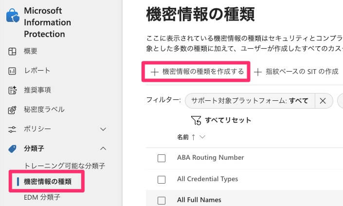 DLPで利用するパターンはInformation Protectionの機密情報の種類から登録します。「機密情報の種類を作成する」から作っていきます。