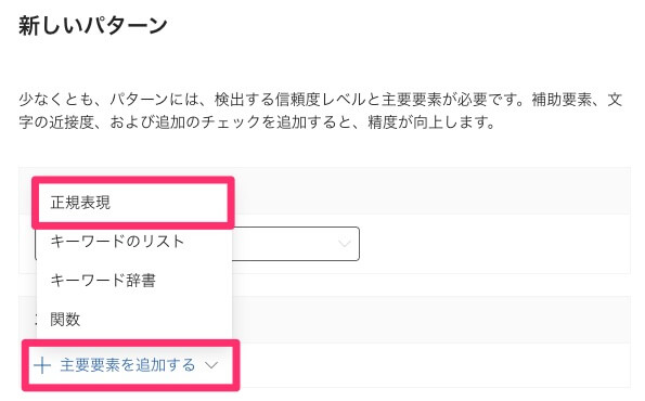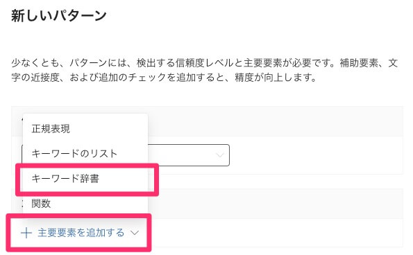 2つ目のパターンとして「従業員メールアドレスのリストを検出する」を登録します。新しいパターンの主要要素を追加するから「キーワード辞書」を選択します。