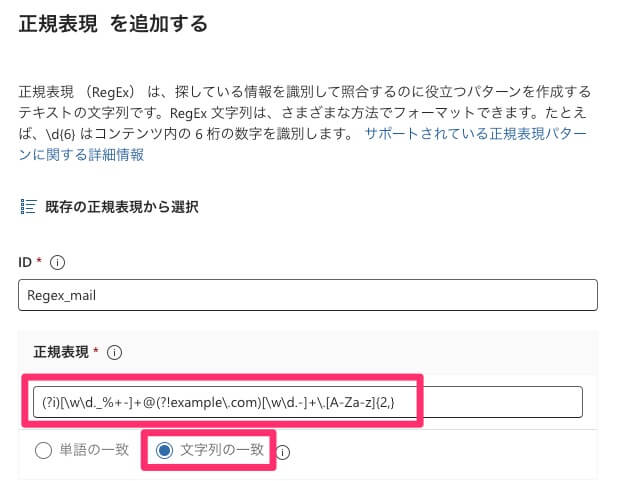 正規表現に(?i)[\w\d._%+-]+@(?!example.com)[\w\d.-]+.[A-Za-z]{2,}を入力して、「文字列の一致」の状態で登録します。