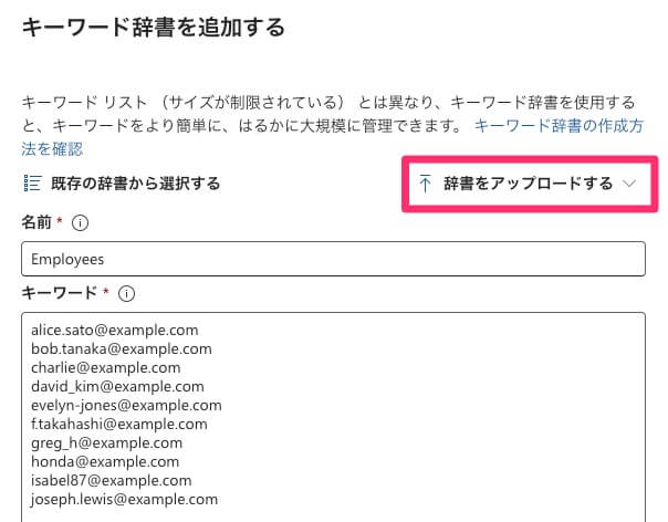キーワード辞書ではあらかじめ作成してある従業員メールアドレスのリストを登録できます。