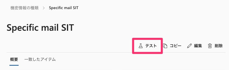 2つの機密情報の種類を作成したら、それぞれテストしていきます。機密情報の種類の詳細ページの「テスト」から実行します。