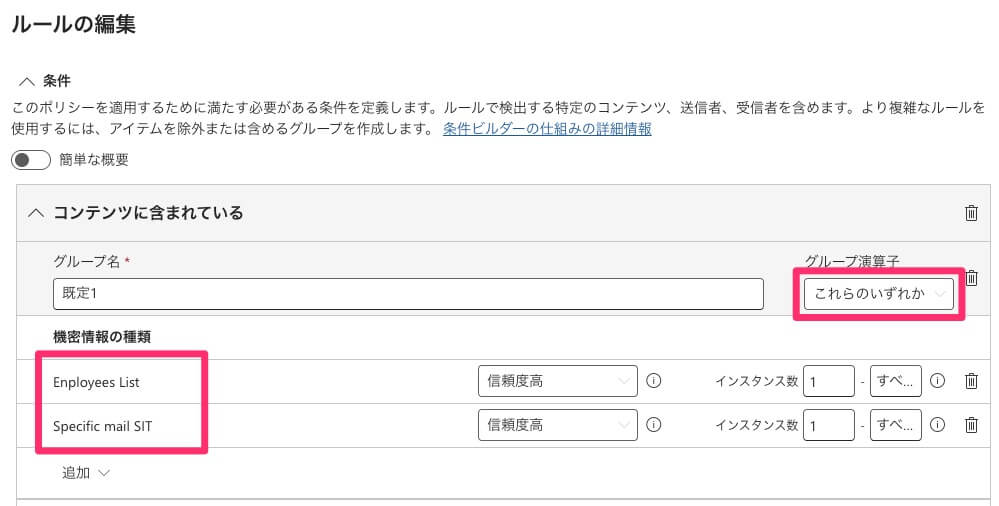 ポリシーのルール作成時の条件として、作成した2つの機密情報の種類を選択します。この時、「グループ演算子」を「これらのいずれか」とする必要があります。組み合わせとして必要ですね。他のルールとの共存は、このグループ演算子が同じであれば基本的に可能です。