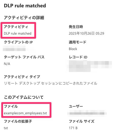 DLP rule matchedで検出され、ファイル名などの情報を確認できます。