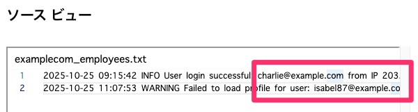 内部のメールアドレスが公開されたものも用意します。(あんまりログとしてこの様になることは無いですが、まあテキスト中に埋め込まれたメールアドレスでの検証のためなのでそんなに気にせず)