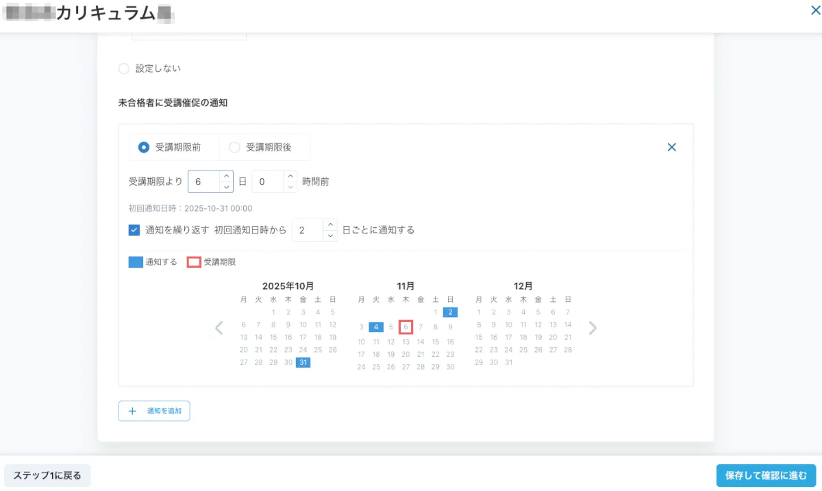 カリキュラムの受講期限に対して、◯日前のリマインドを送信できる機能です。