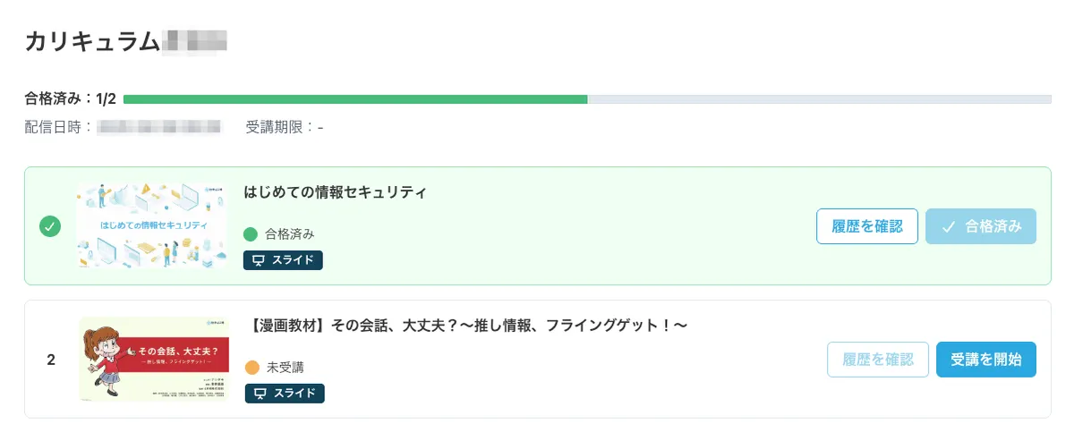 - カリキュラムは、複数教材の進捗をまとめて確認できる