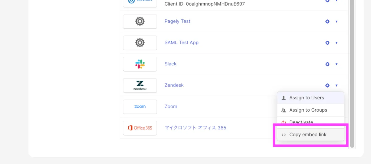 - 次に、ユーザーがSSOでアクセスするための専用URLを取得します。同アプリの「Actions」(またはアプリ一覧の歯車アイコン)をクリックし、「Copy embed link」を選択してURLをコピーします。