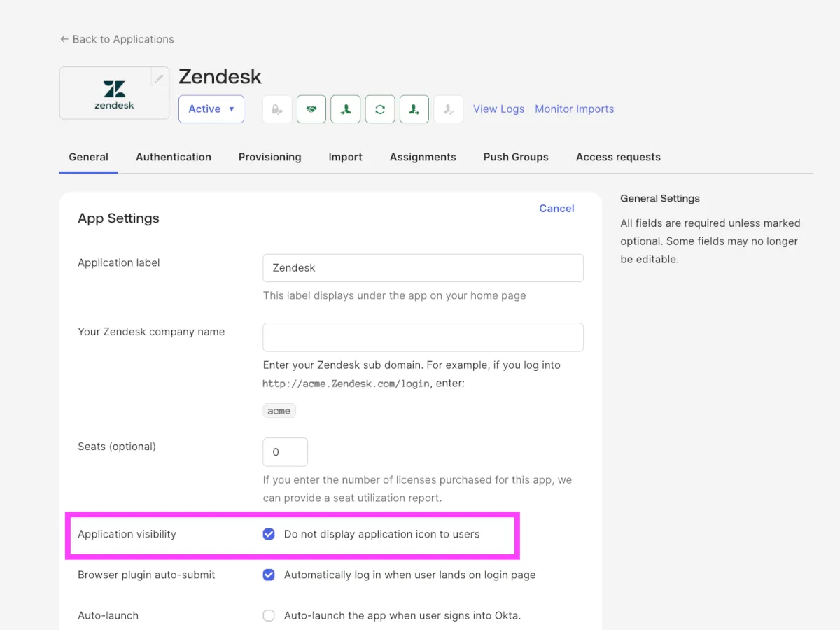 - 「General」タブの「Application Visibility」セクションで、「Do not display application icon to users」にチェックを入れます。
